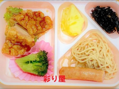 《満3歳・年少の献立》 ※ごはんは持参してください ・チキン南蛮・焼きそば・ブロッコリーのおかか和え・ポークウインナー・パイナップル ※アレルギー対応食…チキンステーキ・焼きうどん ☆☆★☆☆★☆