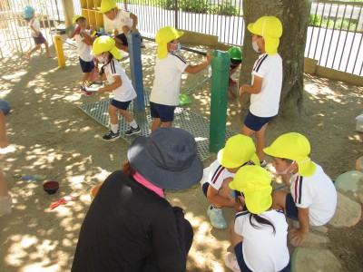 木陰で泡遊びを楽しんでいる子どもたちは、遊びが発展にしてチョコレート色・コーヒー色の泡を作って白い泡を作り始めました。今ではそれを合わせて、ラテアートを楽しむ姿が見られます。