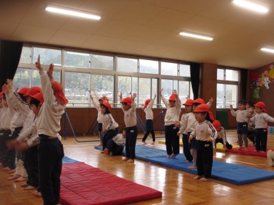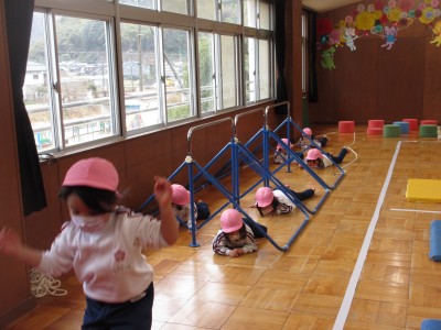 1月わくわくランド(年少) 2023年1月17日 1月16日(月)年少クラスのわくわくランドをしました。 休み明けであり、朝から寒いので準備運動を念入りにしました。 サーキット遊びの後、マットで「ごろんごろん」と体を揺らして後ろに寝転んでから、すかさず三角座りをしたり、すかさず立ち上がったりする練習をしました。 そして、いよいよ前転の練習です。頭のてっぺんを突き刺さず、両手をついた間に頭を入れておへそを見て回るという練習をしました。 最後に鉄棒で「ぶらん・ぶらん」と数を数えてぶら下がることも楽しみました。