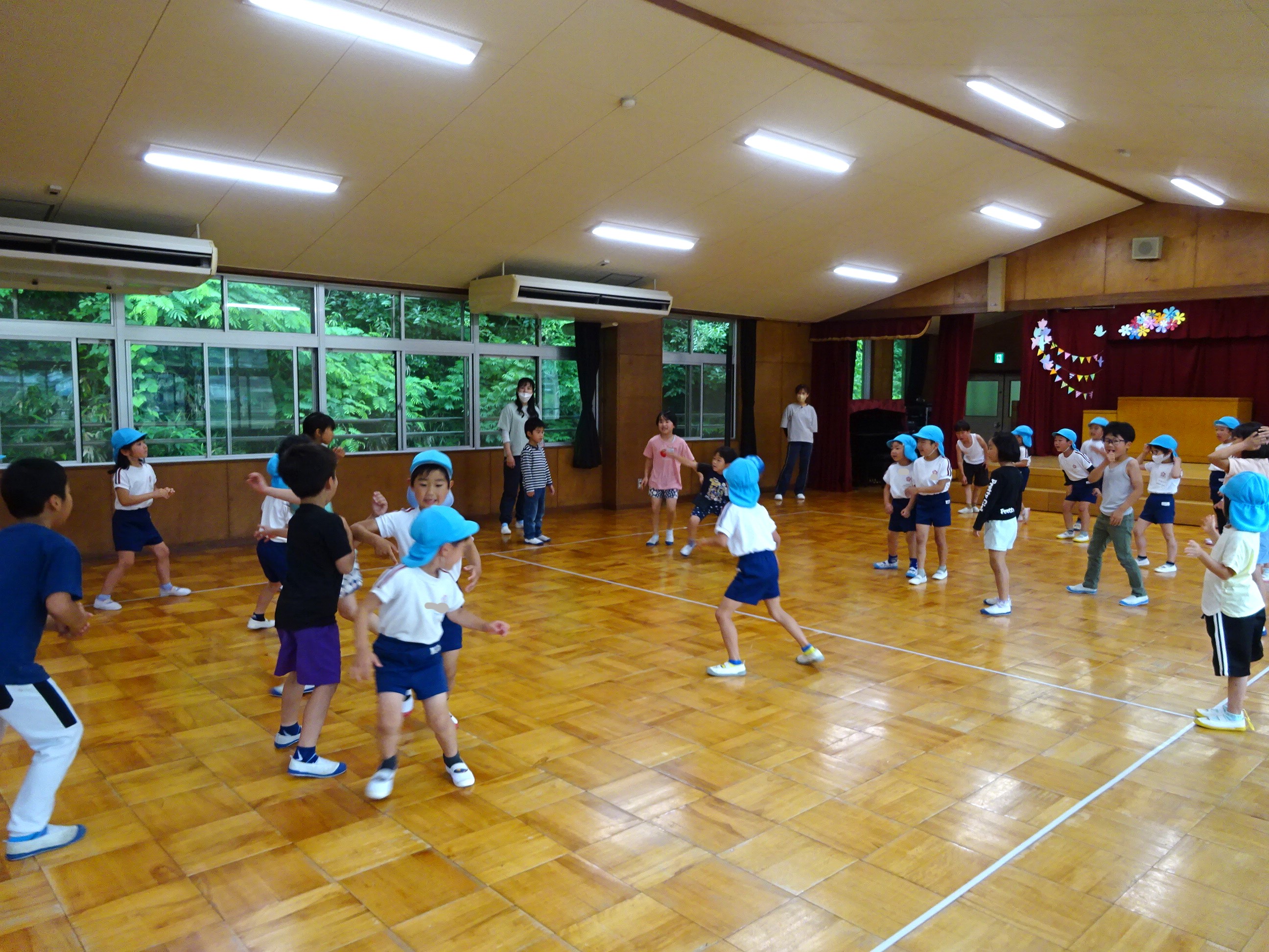 池内小学校との交流(年長) 2023年6月7日 6月6日(火)年少クラスは池内小学校の1・2年生と交流しました。 今回は、園の遊戯室に来てもらいました。 はじめにもうじゅう狩りのゲームをしながら、集まったチームごとで自己紹介をしました。 その後、新聞ジャンケンや、だるまさんがころんだ、ドッジボール等を楽しみ、あっという間に時間が経ちました。 子どもたちは、「ドッジボールが楽しかった」「1年生と遊べて楽しかった」「次は小学校でいろいろなことをしたいな」「1年生になって一緒に遊ぶのが楽しみ」等という感想を持ちました。
