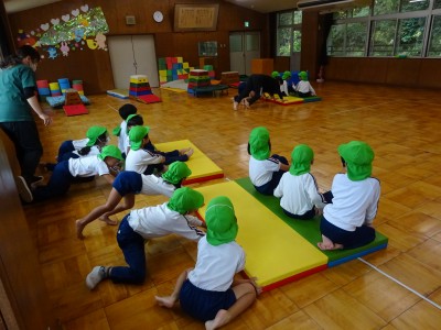 わくわくランド(年長) 2023年11月6日 11月6日(月)に年長学年はわくわくランドをしました。 はじめにマットを使って遊びました。マットの上に友達に乗ってもらいました。そして、そのマットを押して友達を落とさないように運びました。 次に鉄棒をしました。足抜き回りや逆上がりの練習をしました。一人一人おしゃべりすることなく真剣に取り組みました。 最後に跳び箱をしました。跳び箱は開脚で跳ぶ練習をしました。自分で跳んでみたい跳び箱を選んで挑戦しました。先生に手をつくのにふさわしい跳び箱の場所を説明してもらうとそこを意識して頑張りました。