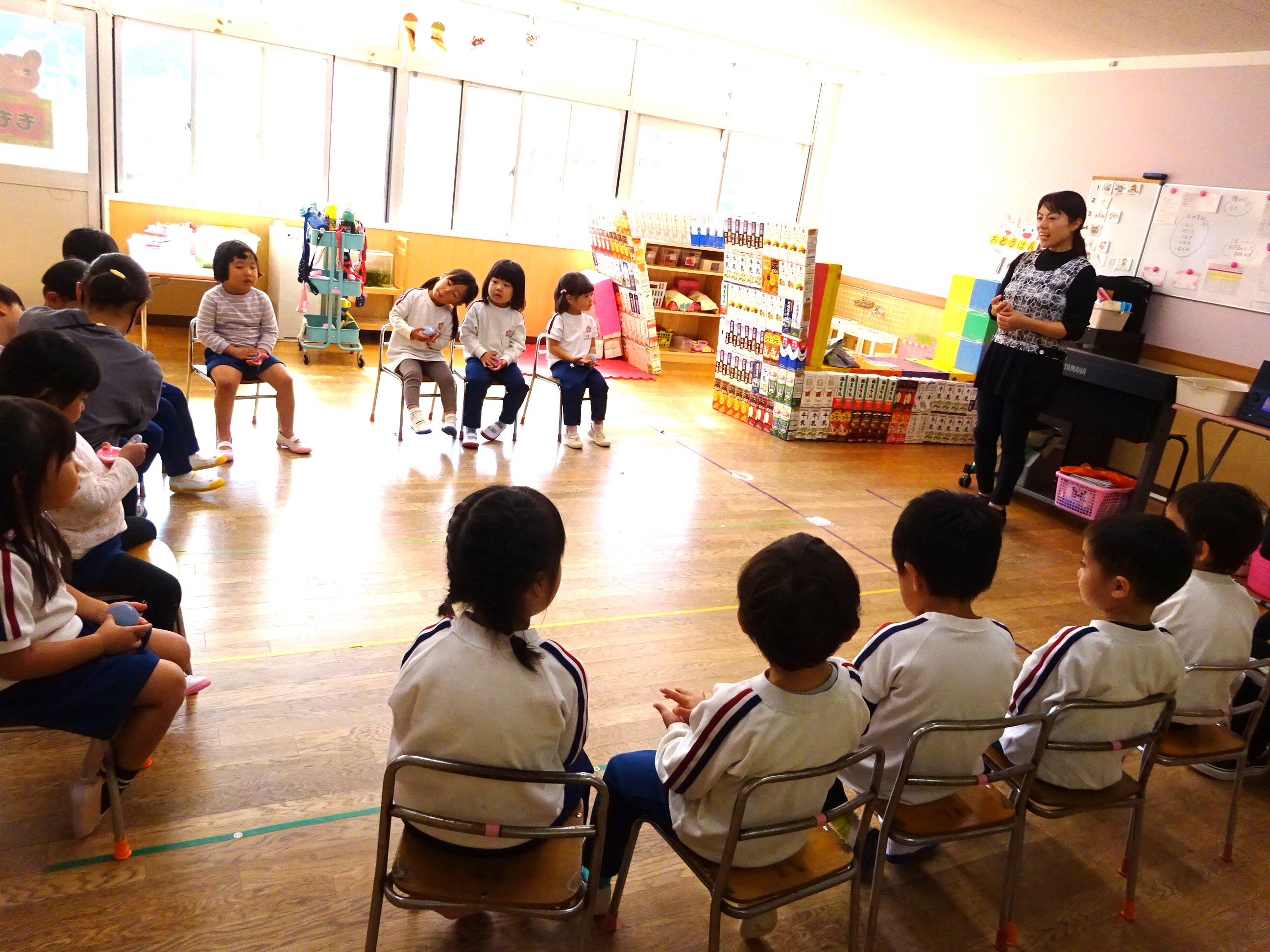 最後に「〇〇さん」(タン・タン・タン・ウン)と一人一人名前を呼んでもらって、「はあい」(タン・タン・タン・ウン)でカスタネットを叩きながら返事をする練習も楽しみました。