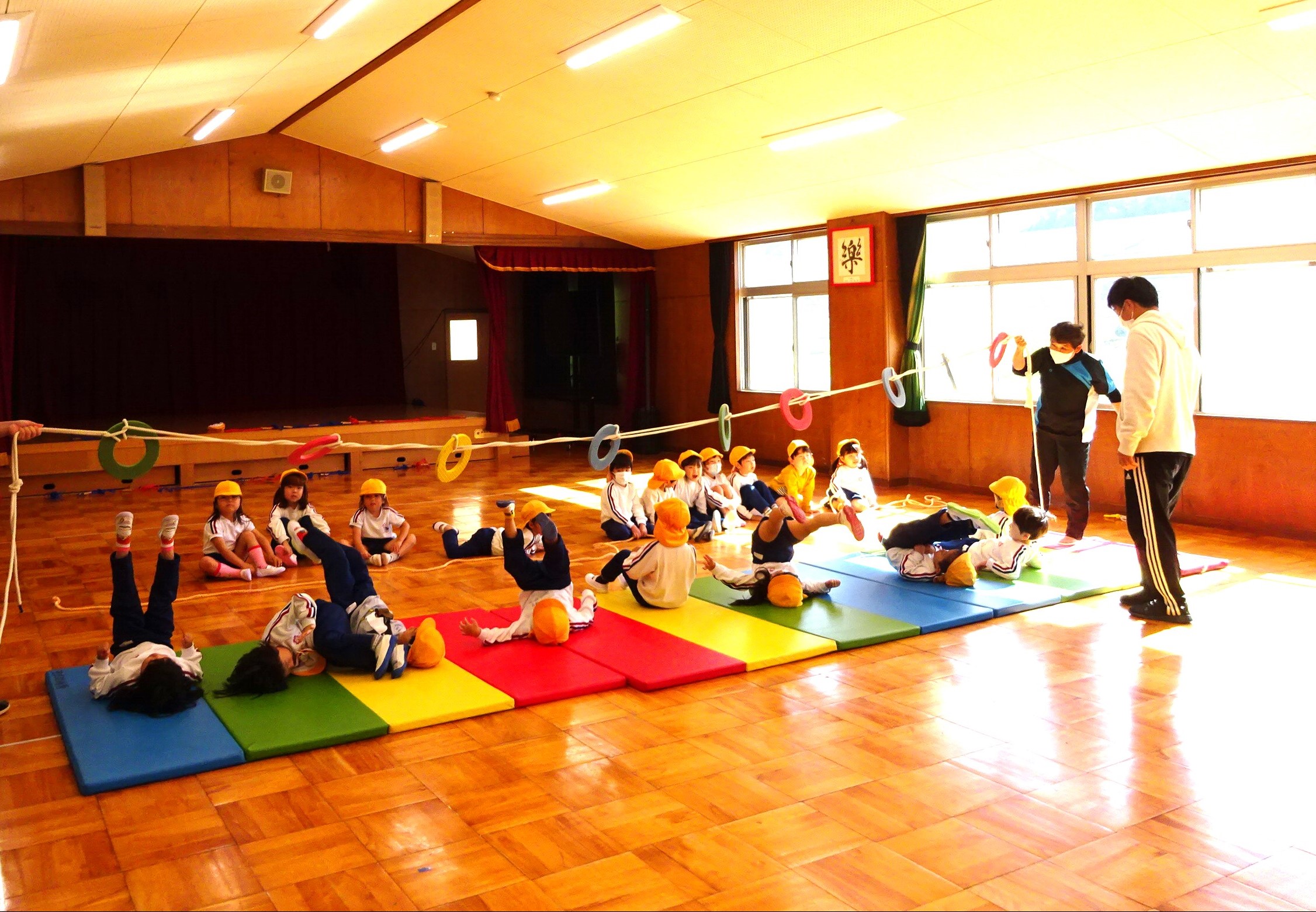 わくわくランド(年中) 2023年11月9日 11月8日(水)年中学年はわくわくランドをしました。 縄跳びでは、一人一人で短縄の練習をたくさんしました。短縄を後ろから前に回してきて、その縄をピョンと両足で飛び越える練習を丁寧にしました。無意識に跳ぶ前より足が前に出ることが分かりました。そして、短縄で跳びながら走っていく練習も頑張りました。 他にも長縄に円い形をつるしたものに体が触れないようにくぐる練習をしたり、蹴り上げて円い形に触れるようにする練習をしたりして楽しみました。