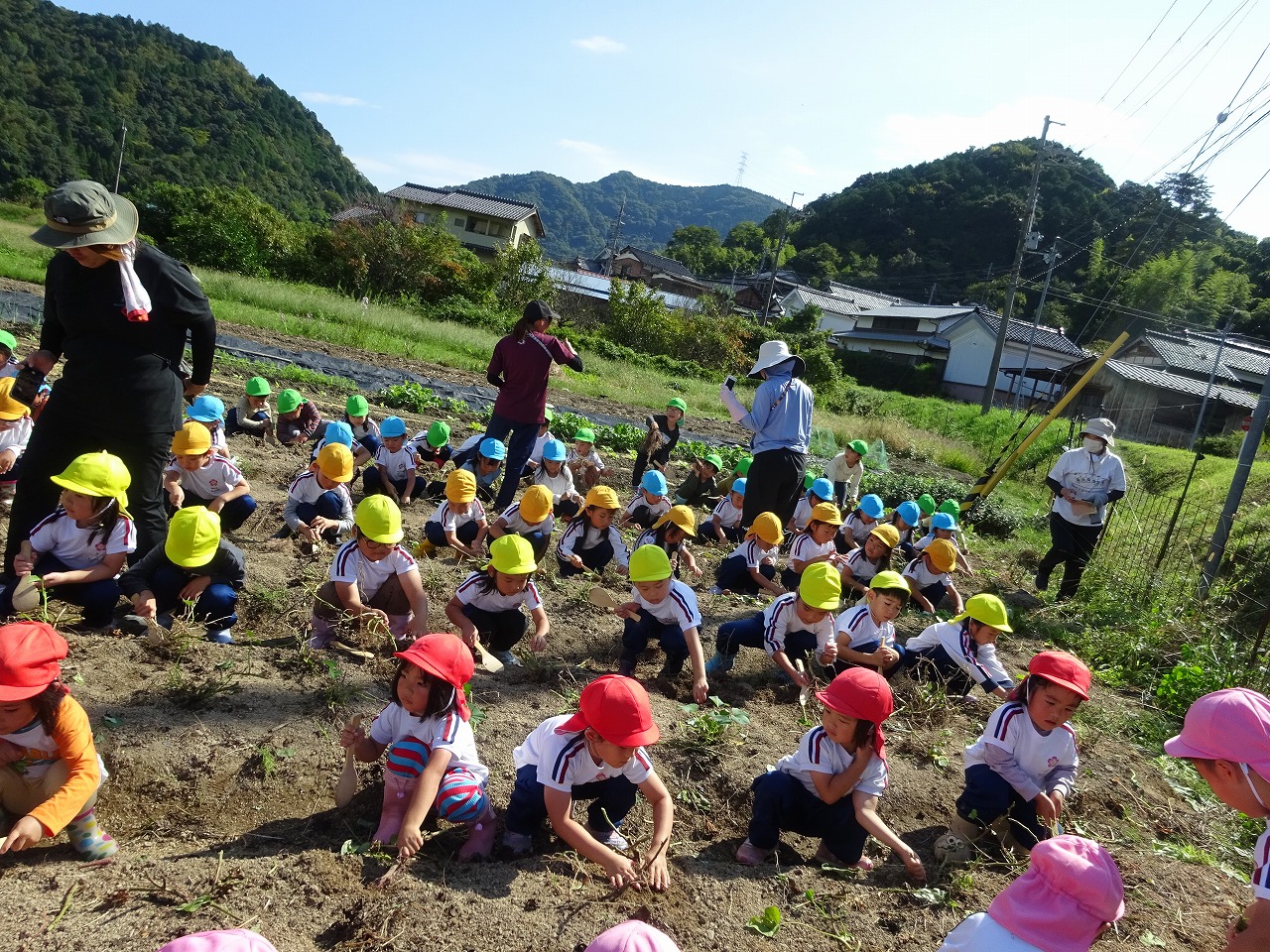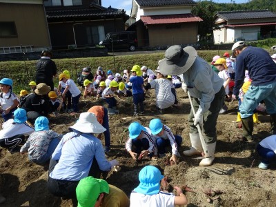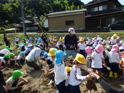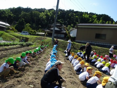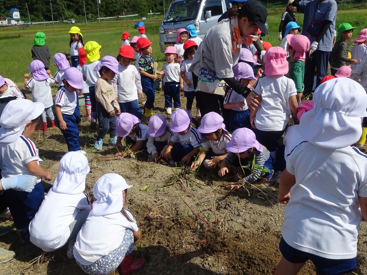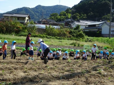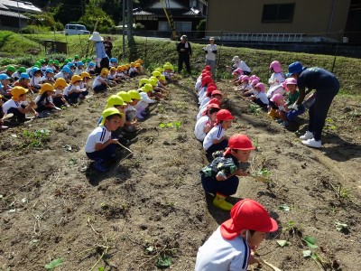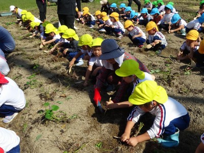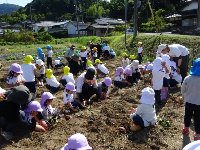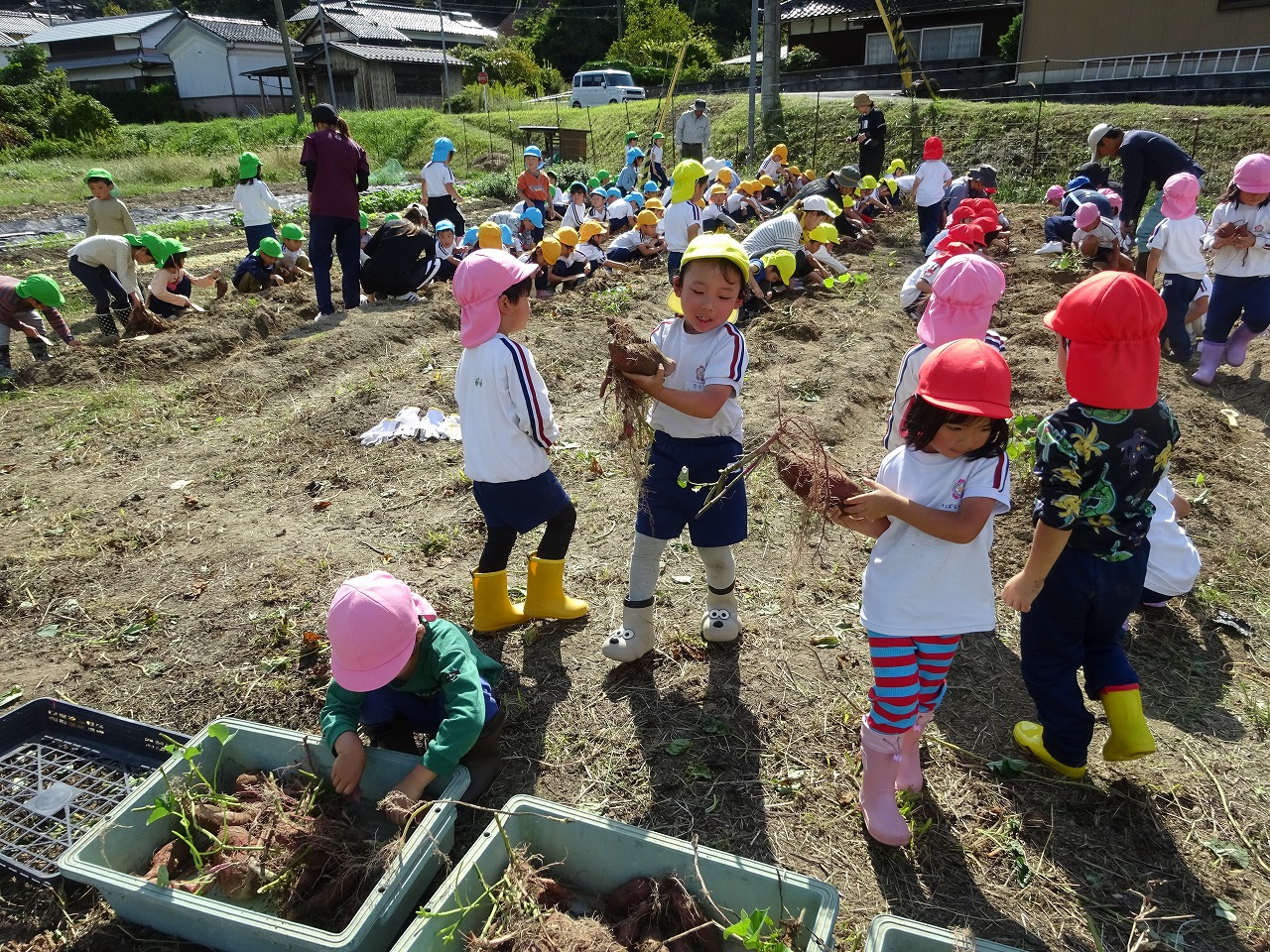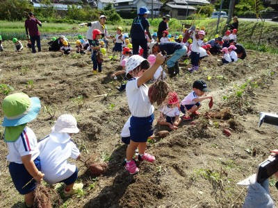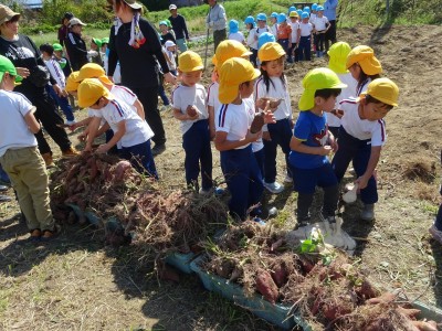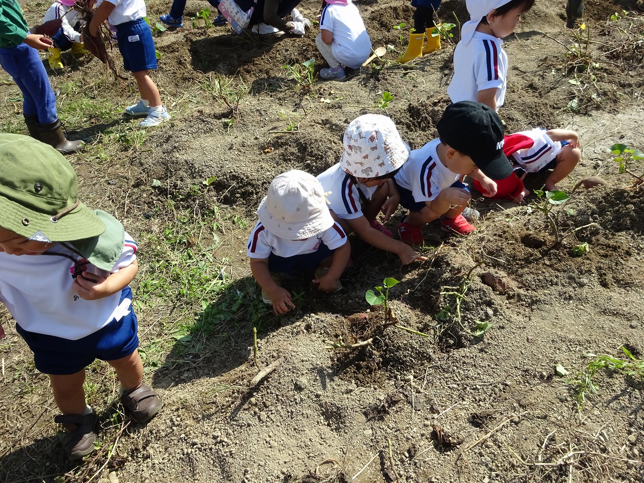 サツマイモ堀り 2025年10月10日 10月8日(水)年長・年中・年少・満3歳・満2歳全クラスでサツマイモ畑に行き、芋ほりをしました。地域の先生にもお世話になり、丁寧に土を掘っていきました。赤紫色のサツマイモを発見すると大喜びでそっと取り出しました。昨年、地域の先生に籾殻をまいて土を柔らかくしていただいたお陰で、とても掘りやすかったです。また、予想以上に多くの収穫がありました。全園児がお土産に持って帰った他、園でも皆で食べたいと思います。