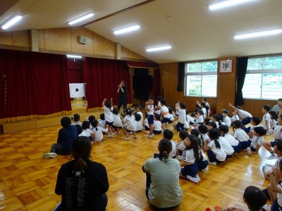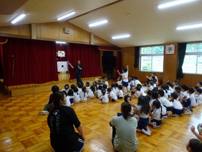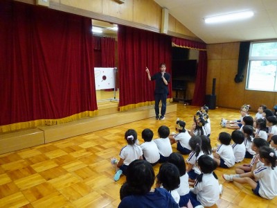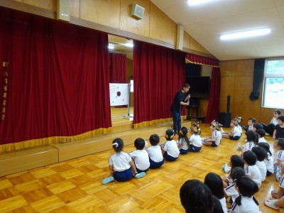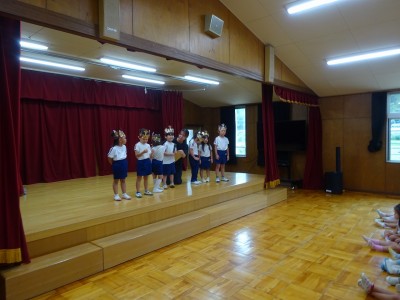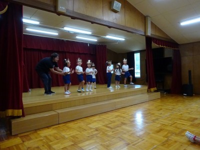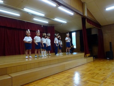 10月誕生会 2025年10月17日 10月16日(木)、10月の誕生会をしました。10月生まれの子どもたちは、ステージに立ち、皆からの祝福を受けました。 そして、大きくなったらなりたいものを発表し、季節の歌の「きくの花」を歌いました。エビカニクスの体操を楽しんだ後、一人ずつプレゼントを受け取りました。 最後は先生からの「お楽しみクイズ」でした。「虫メガネの中は何でしょう」の問いに、「どんぐり」「くり」「ハロウィン」等、季節のものを答えました。