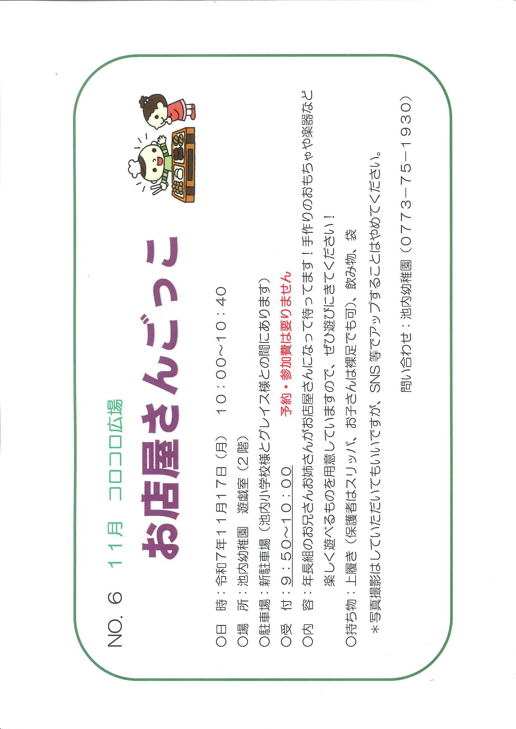 11月 コロコロ広場(11/17)未就園児 2025年11月7日 11月のコロコロ広場は、お店屋さんごっこをします。 手作りのおもちゃや楽器など楽しく遊べるものを用意していますので、おともだちを誘ってぜひ遊びにきてください。 詳細→こちら
