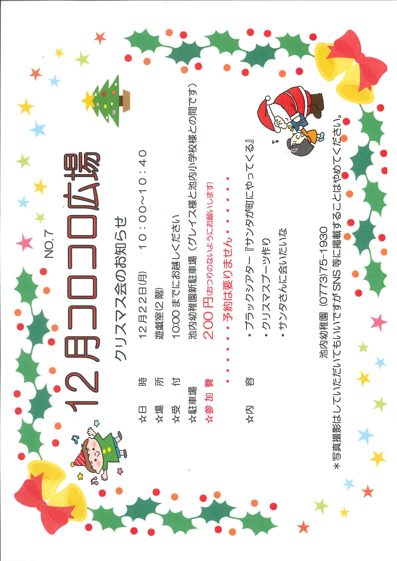 12月 コロコロ広場(12/22)未就園児 2025年11月26日 12月のコロコロ広場はクリスマス会をします! ブラックシアターを見たり、クリスマス製作をしたりと親子で楽しめるものを用意しています。 サンタさんも、プレゼントを持ってきてくれるかな? 予約は要りませんが、参加費200円になります。 楽しみに来てください! 詳細→こちら