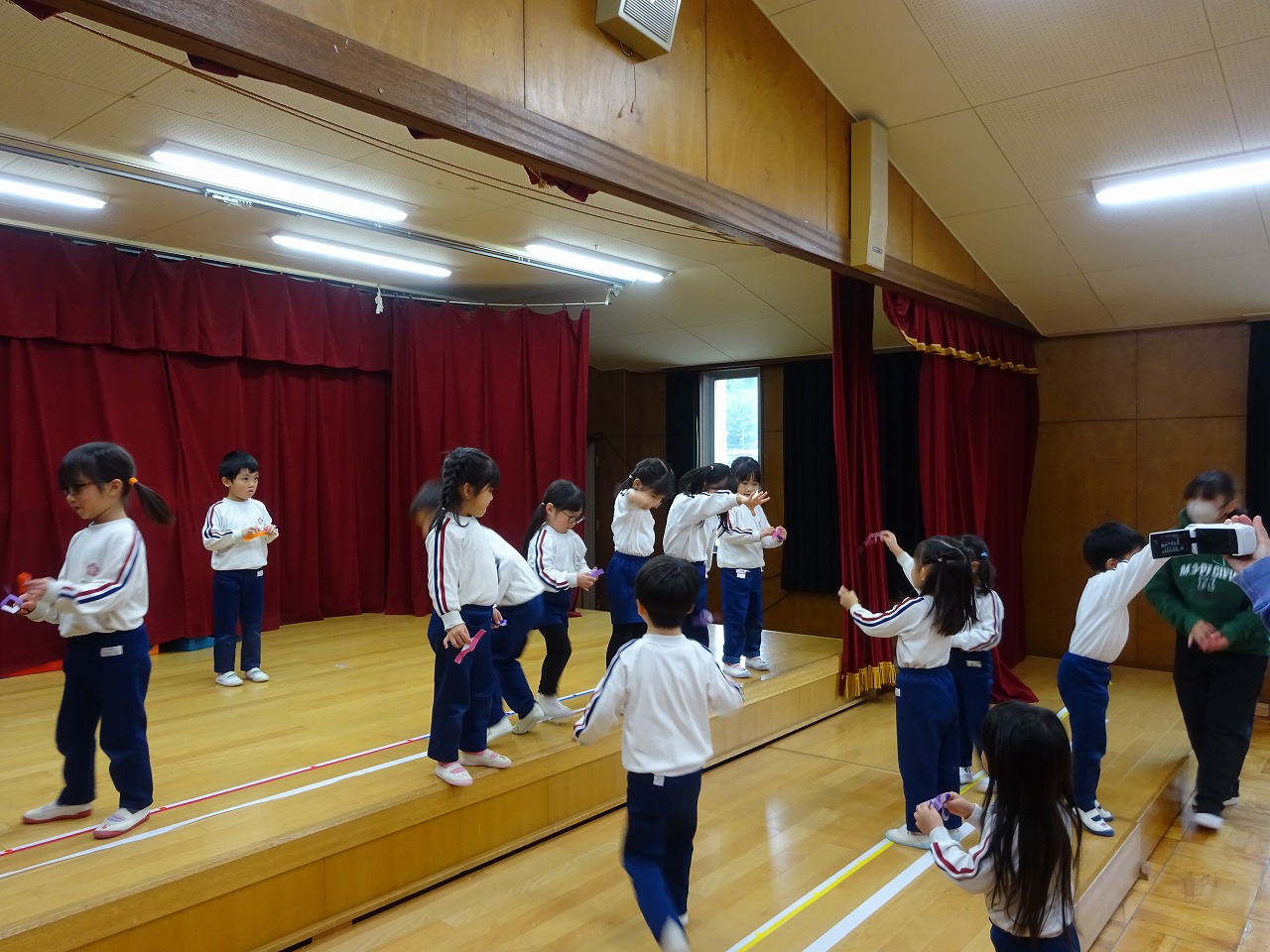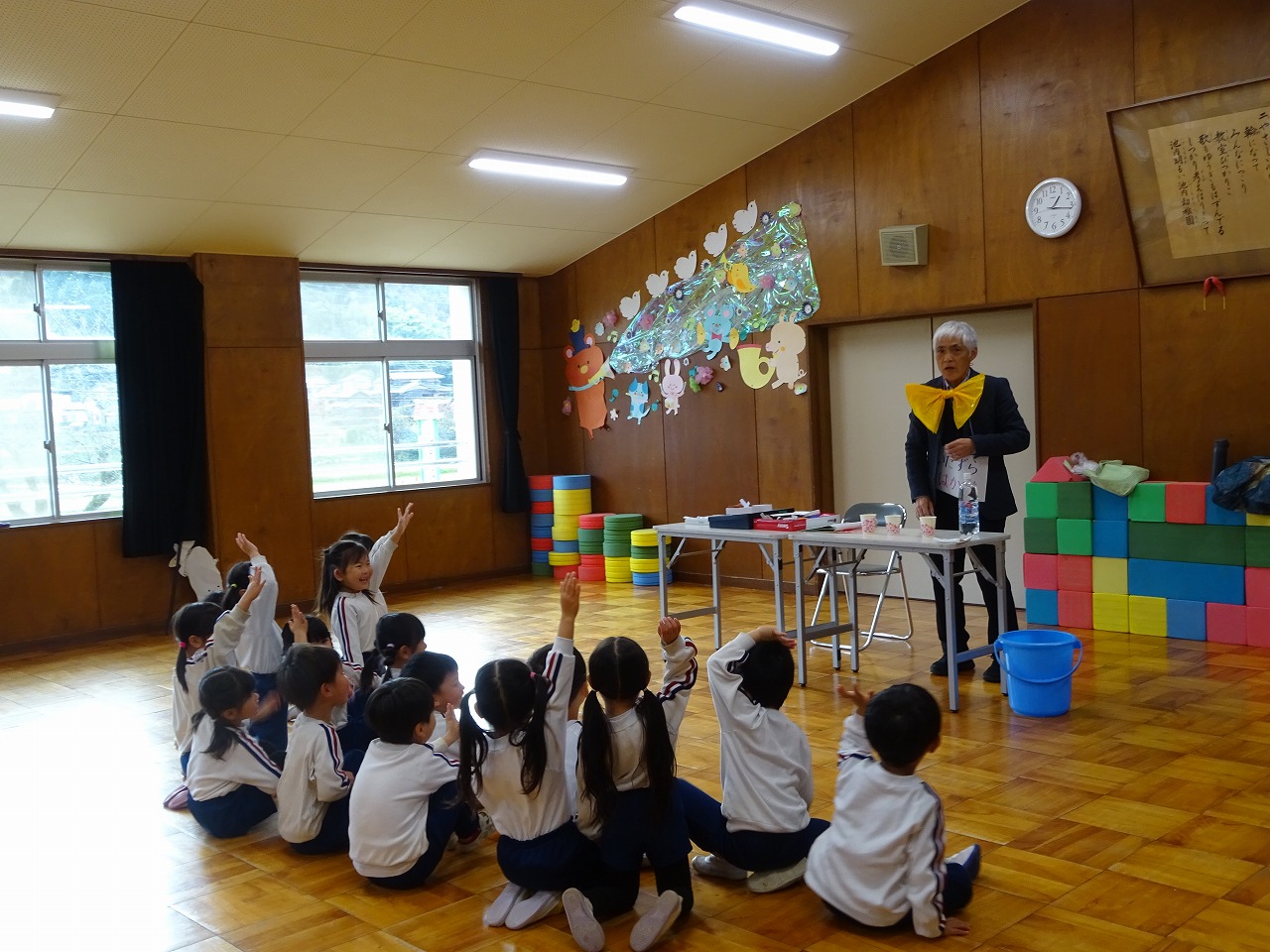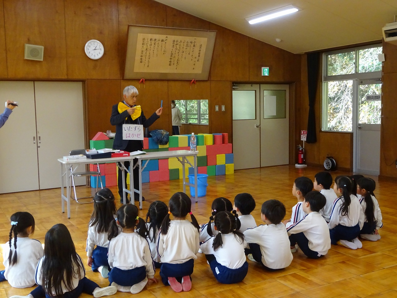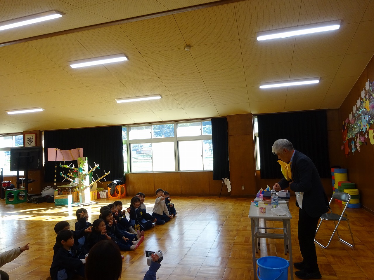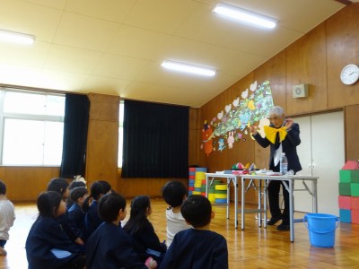 いたずら博士来園 2025年12月5日 12月4日(木)いたずら博士に来園してもらい、年中学年が「とぶもの」について実験をしました。まずは「空気」について学び、そこから自然の中にある種が舞う様子をイメージした紙工作を使って「とぶもの」を楽しみました。目には見えない空気を使ってとぶ、空気があるから回るという遊びを通して理科を学ぶ時間になりました。
