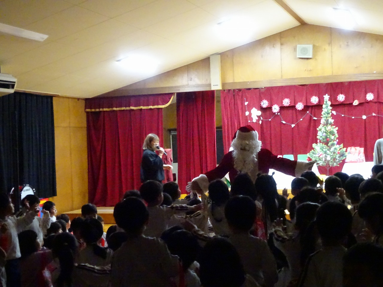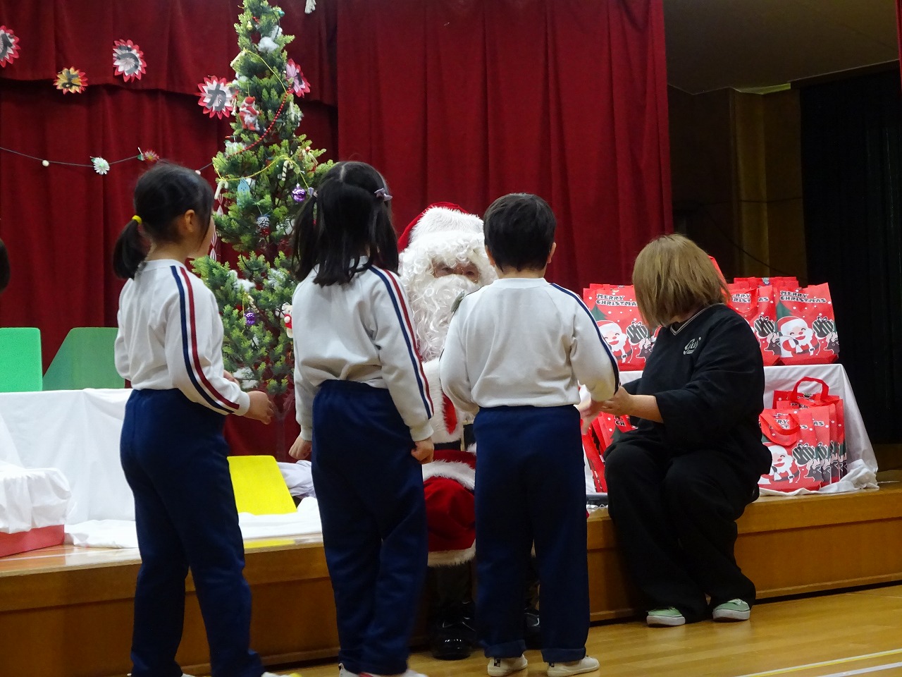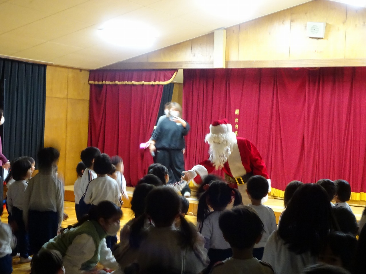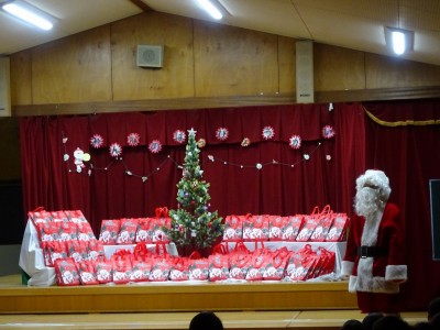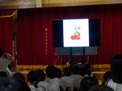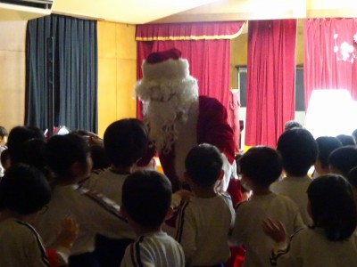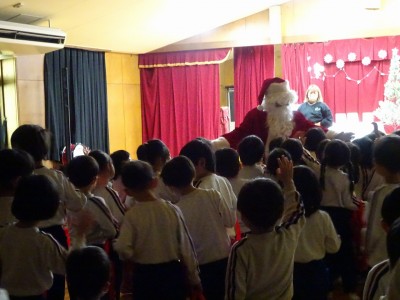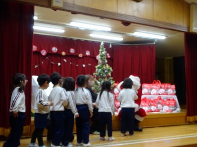 クリスマス会 2025年12月22日 12月19日にクリスマス会を行いました。あわてんぼうのサンタクロースの歌を歌い、シルエットクイズやブラックシアターをして盛り上がった後、どこからか鈴の音が聞こえてきました。なんとサンタクロースが園まで来てくれたのです。サンタクロースは、子どもたちにゆっくりと優しく対応していただいたので、満2歳~年長学年まで誰一人泣くことなくプレゼントを受け取りました。子どもたちは、お礼に歌のプレゼントをしました。「次の幼稚園の子どもたちも待っているから」とお別れの時間になると手を振って見送りました。