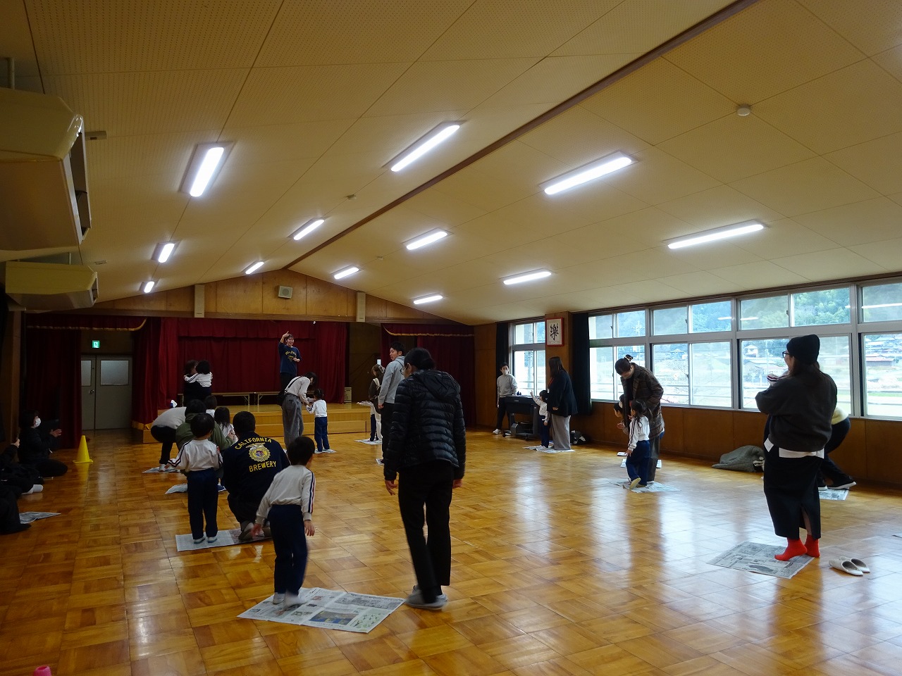 ばら組参観 2026年1月19日 1月15日(木)ばら組の保育参観を行いました。はじめに日々行っている「おはじまり」の時間の中で行っている季節の歌や当番活動の様子を公開しました。次に「クラス活動」の様子として新聞を使った遊び(新聞島・新聞じゃんけん)を親子で楽しみました。