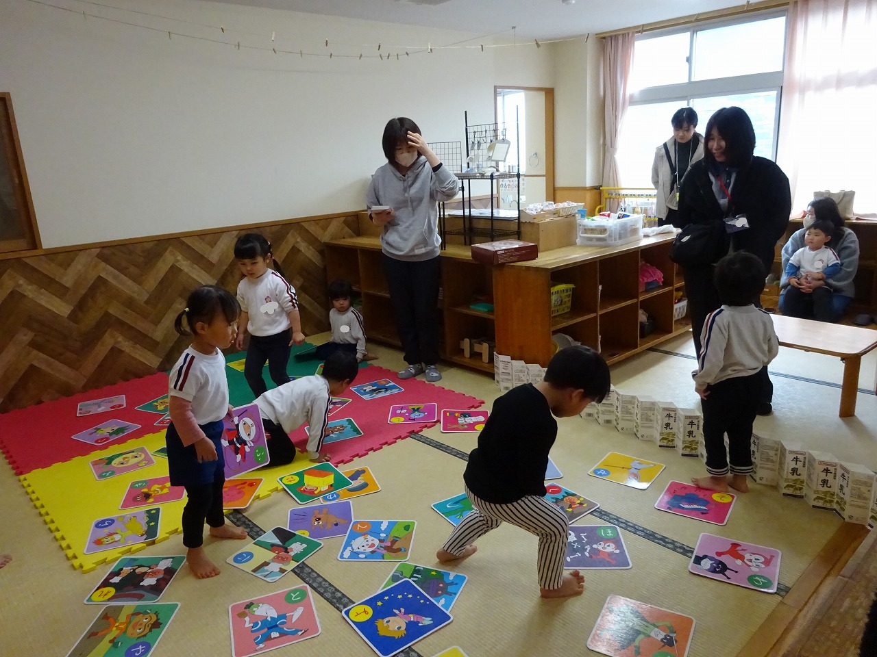 どんぐり組参観 2026年1月19日 1月16日(金)どんぐり組の保育参観を行いました。まず、「クラス活動」で季節の歌を歌う様子などを見ていただきました。次に自由遊び(カルタ取り・シール貼り等)や製作遊び(凧作り・コマ作り)をする様子を公開しました。