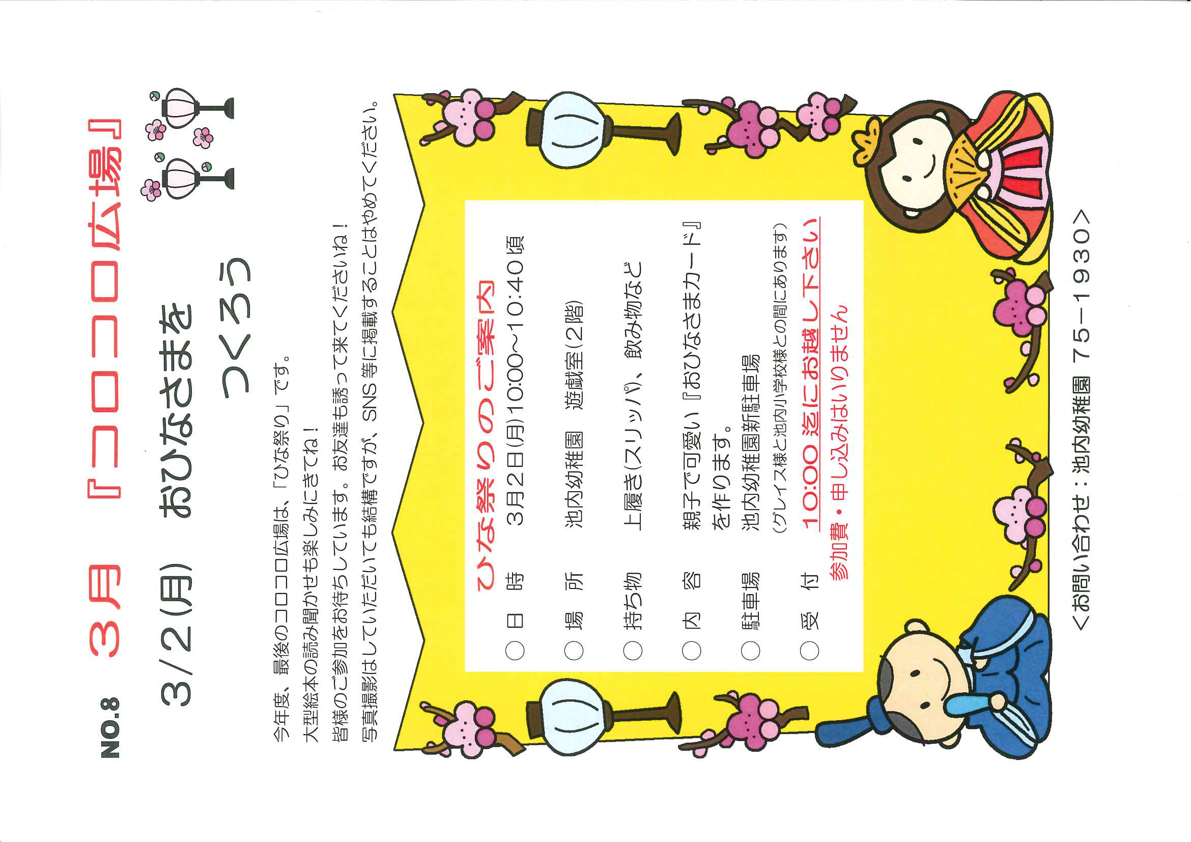 3月 コロコロ広場(3/2)未就園児 2026年1月22日 3月のコロコロ広場はひなまつり製作をします。 大型絵本や親子で楽しく遊べると良いなと思っています。 おともだちを誘って、ぜひ遊びにきてください! 詳細→こちら
