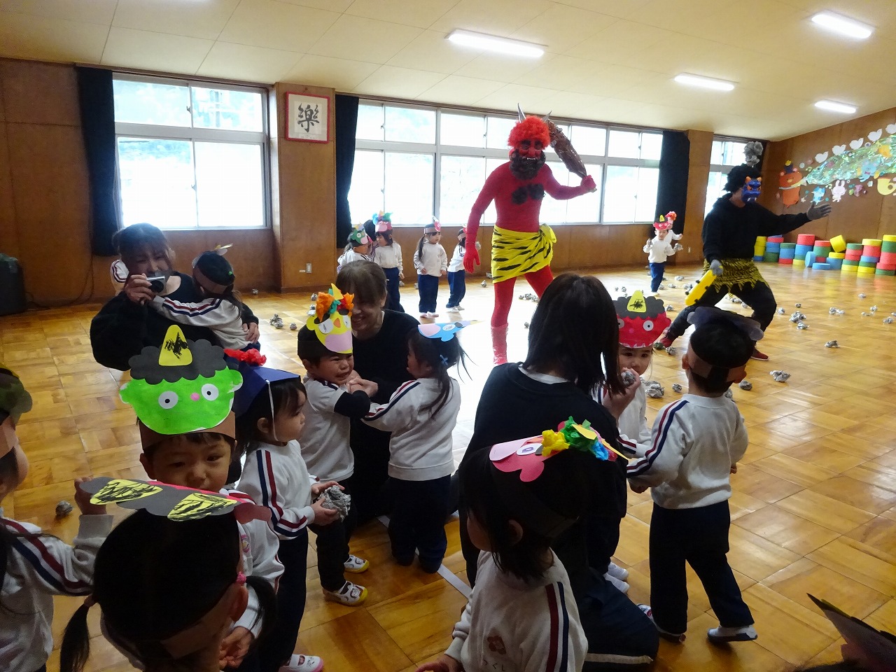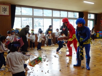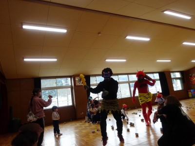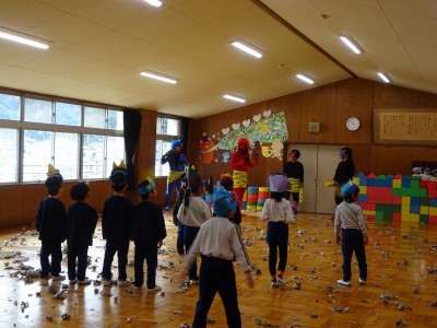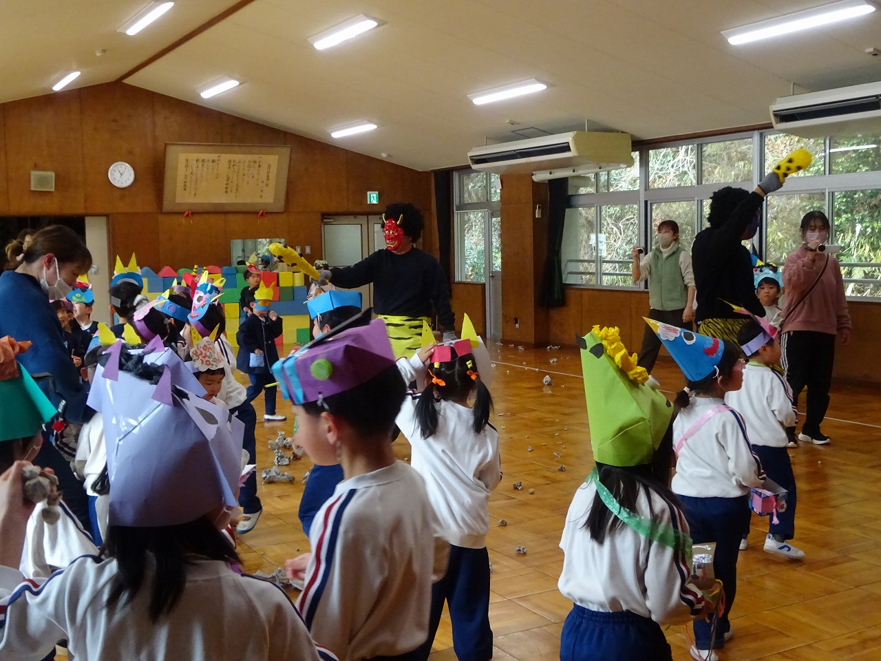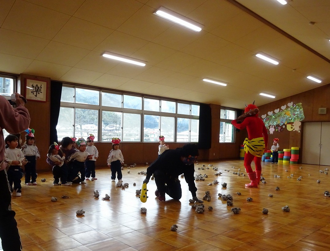 豆まき遊び 2026年2月3日 2月3日(火)豆まき遊びをしました。山から園にきた鬼は4人もいました。怖がる子どもたちや新聞紙の豆を投げて戦う子どもたちと様々でしたが、節分らしいひと時を過ごしました。鬼から山に帰る前に、「友達となかよくするんだぞ」「好き嫌いなく食べるんだぞ」「お家の人の言われることをよく聞くんだぞ」等、受けたメッセージをしっかり聞いてきた子どもたちでした
