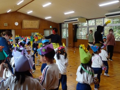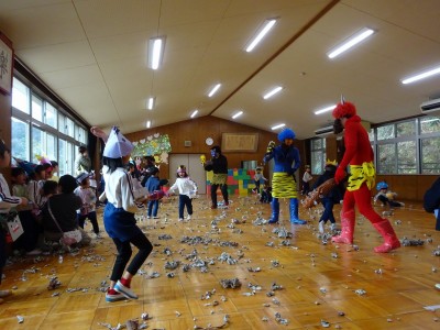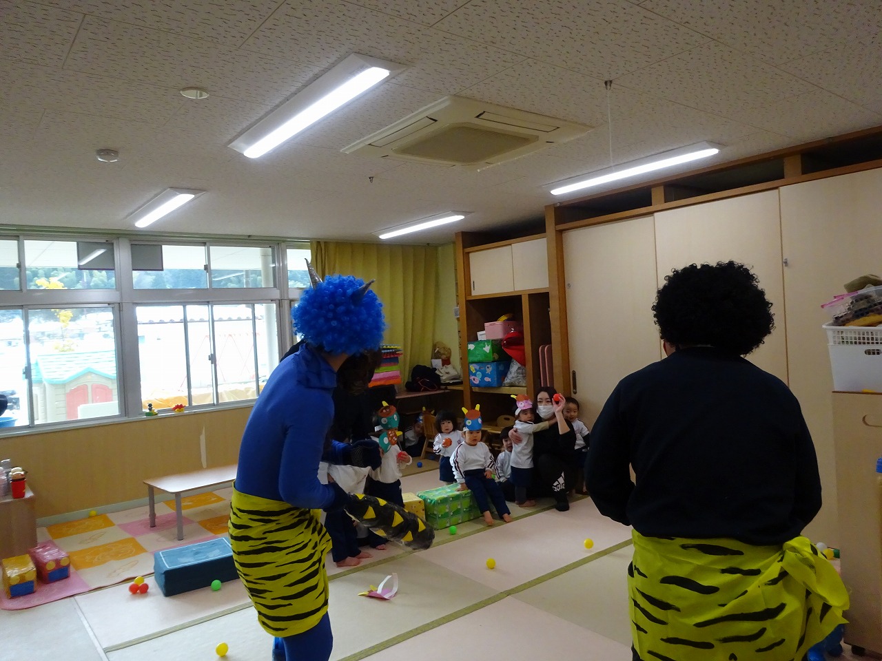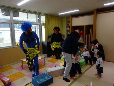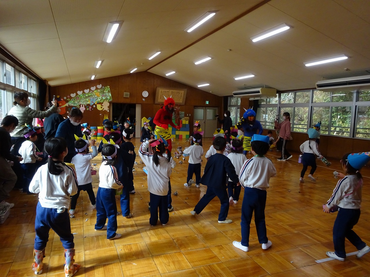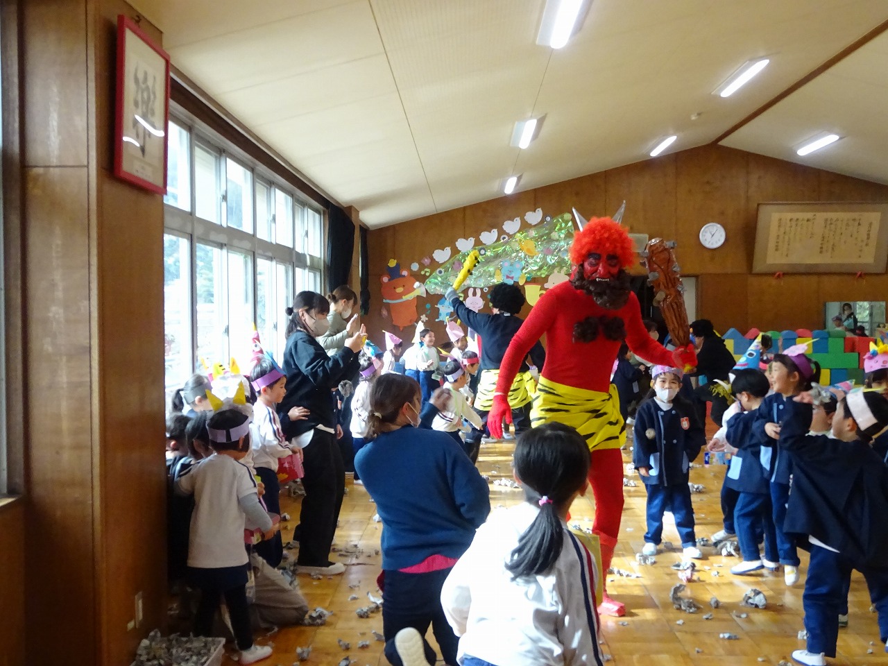 豆まき遊び 2026年2月3日 2月3日(火)豆まき遊びをしました。山から園にきた鬼は4人もいました。怖がる子どもたちや新聞紙の豆を投げて戦う子どもたちと様々でしたが、節分らしいひと時を過ごしました。鬼から山に帰る前に、「友達となかよくするんだぞ」「好き嫌いなく食べるんだぞ」「お家の人の言われることをよく聞くんだぞ」等、受けたメッセージをしっかり聞いてきた子どもたちでした