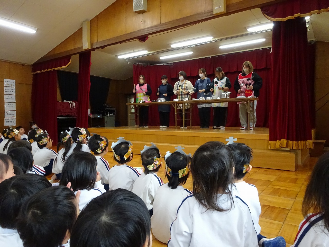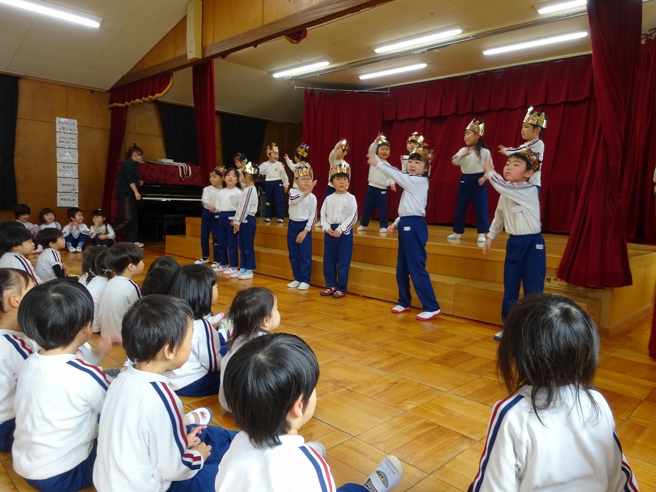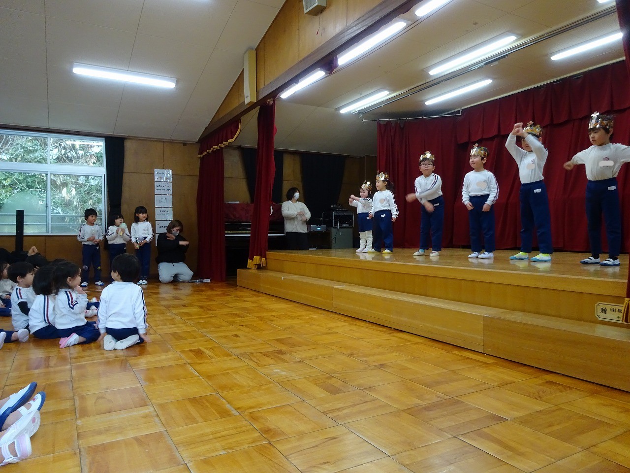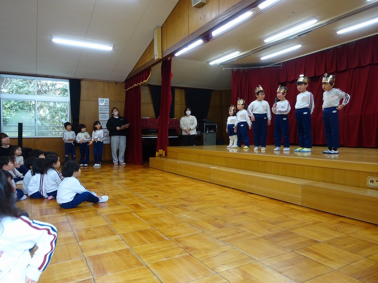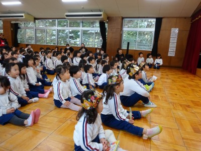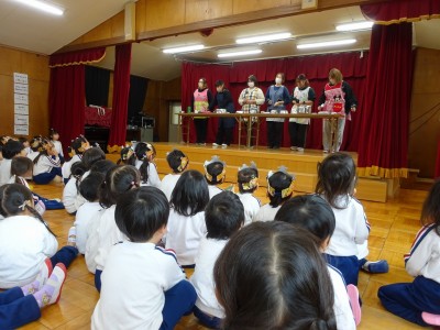 両方とも年長学年が司会進行をしました。12・1月の誕生会は「やぎさんゆうびん」の歌を歌い、「エビカニクス」の体操をしました。先生からのお楽しみはなんと「キッチンオーケストラ」でした。楽しく鑑賞しました。2月の誕生会は「まめまき」の歌を歌い、エビカニクス」の体操をしました。先生からのお楽しみは「あたまおしりゲーム」でした。頭が「き」おしりが「ん」なら何でしょう?の問いに、園児は真剣に考えました。正解は「きりん」でした。