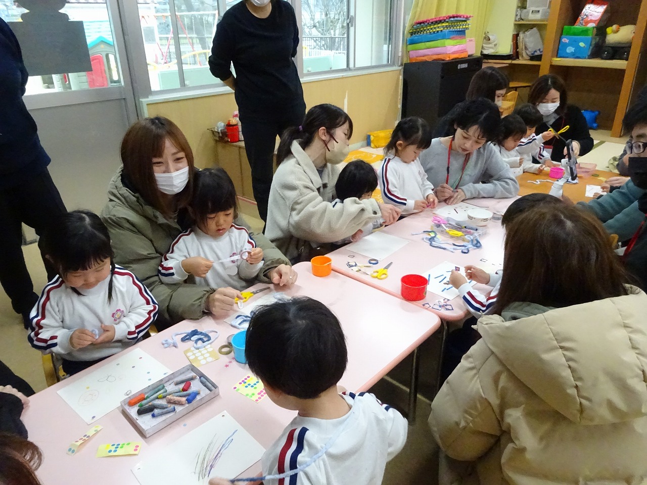 ゆり組・くるみ組参観 2026年2月16日 2月12日(木)大雪のため、延期していたゆり組の参観日を行いました。ゆり組カルタやカードめくりを楽しみました。チーム決めでは、自分たちで人数を考えて2チームに分かれることができ感心しました。 2月16日(月)は同じく延期になっていたくるみ組の参観をしました。まず部屋でシール貼りやお絵描きをした後、遊戯室で自由遊びを楽しみました。