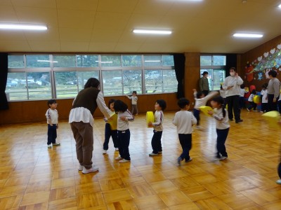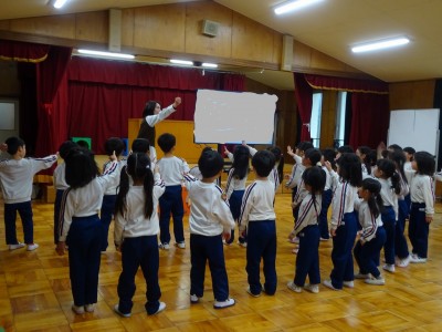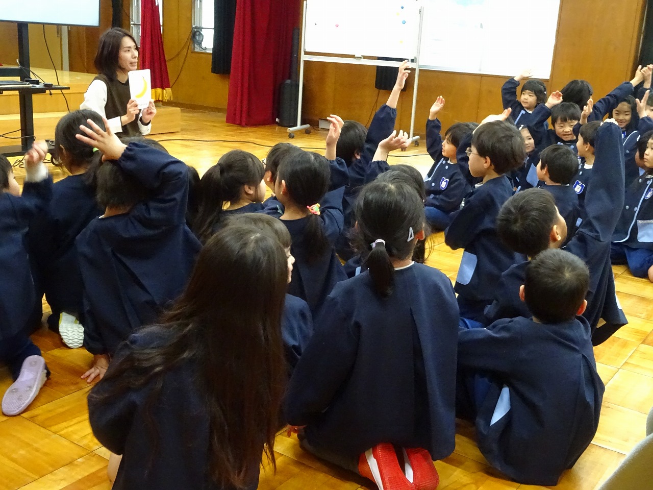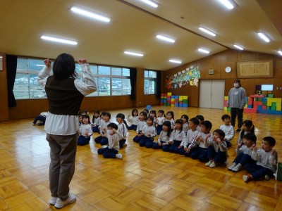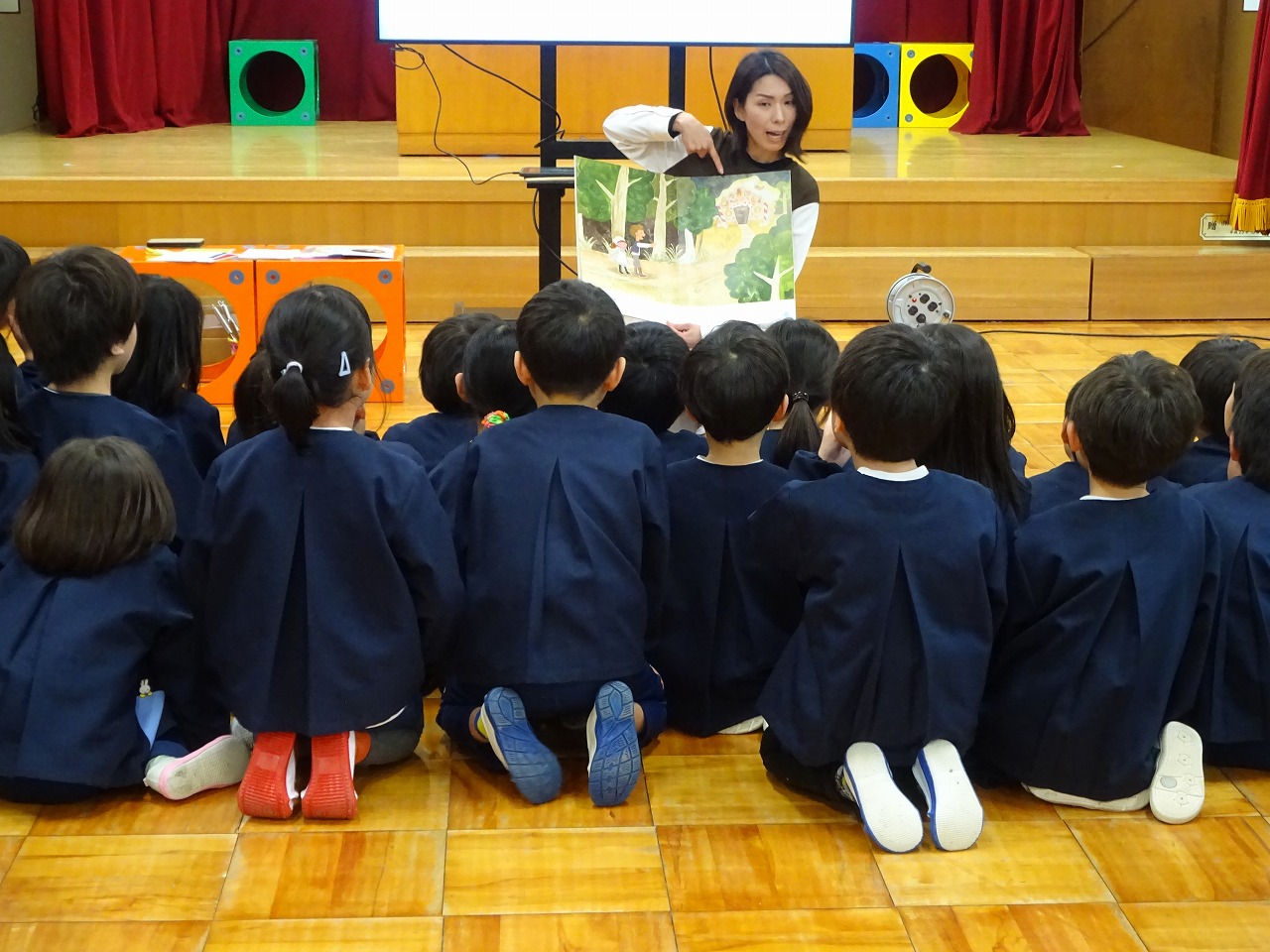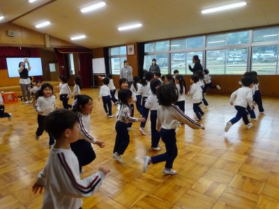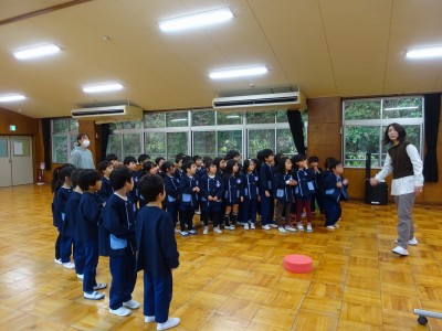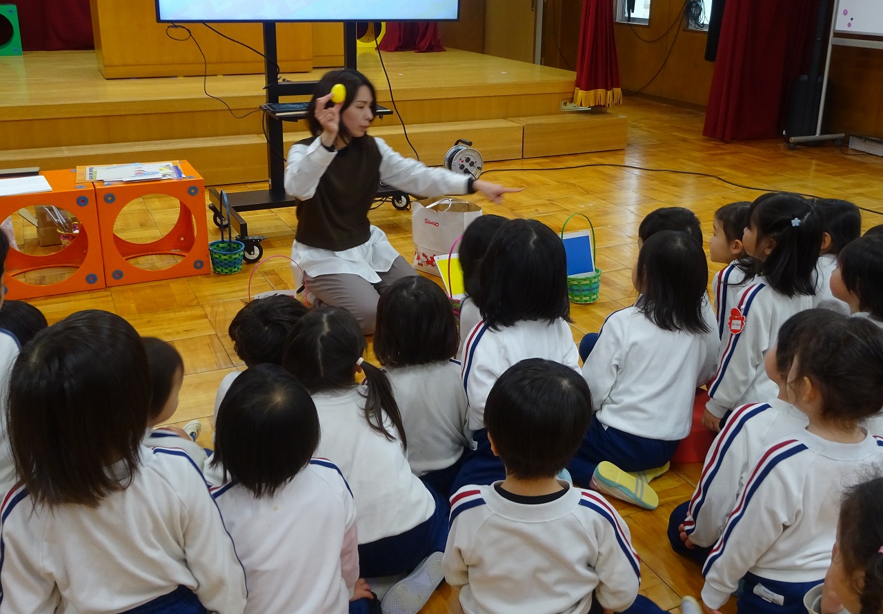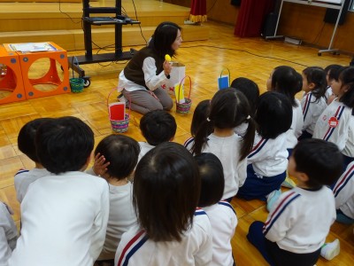 英会話体験 2026年2月26日 2月25日(水)英会話のゲストティーチャーをお招きして、年長・年中・年少が異文化体験をしました。年少・年中は、英語の指示で体を動かす遊びやイースターにちなんで卵を使ったゲームをしました。年長は、絵カードを使って「好きですか・嫌いですか」の英会話を楽しんだり、英語に合わせて踊ることを楽しんだりしました。