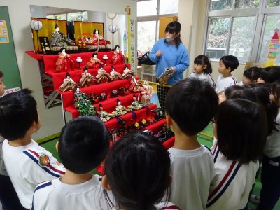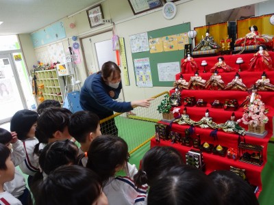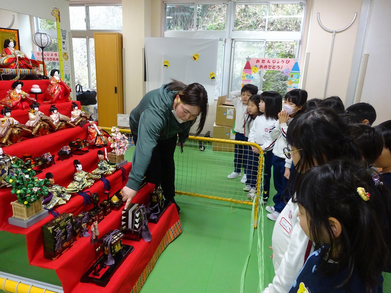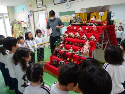 ひな祭り 2026年3月6日 3月3日はひな祭りです。 クラスごとに雛人形の前にそろって、ひな祭りの歌を歌いました。先生から三人官女や五人囃子、お道具についての説明を受け、興味深く聞く子どもたちでした。
