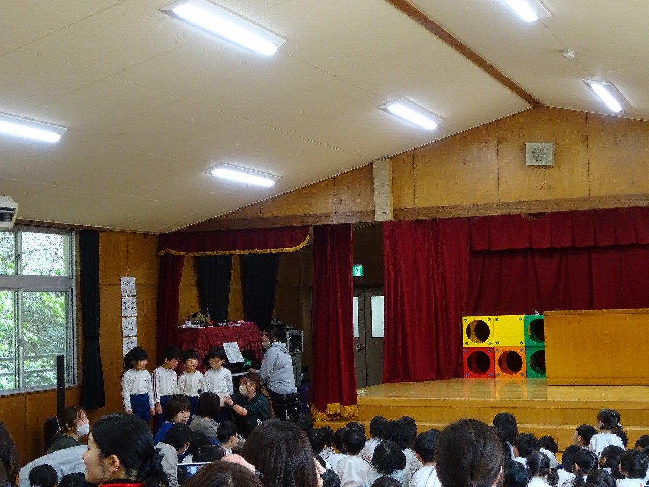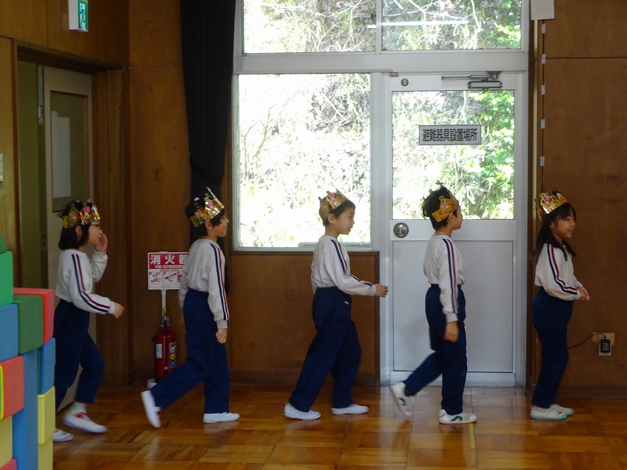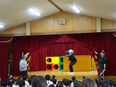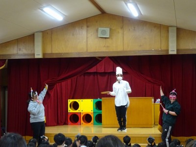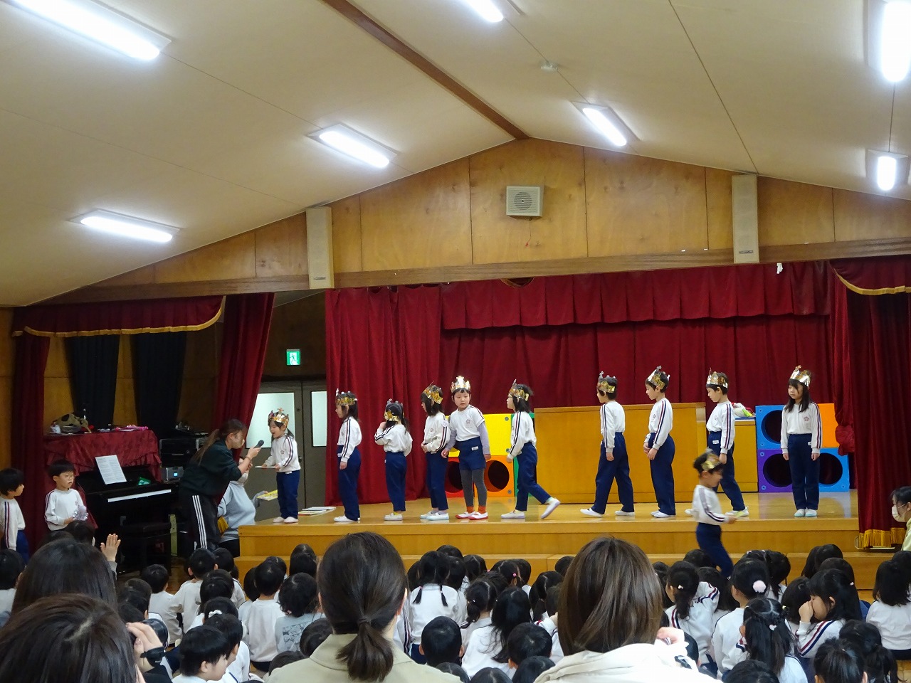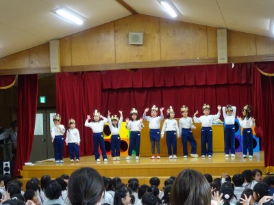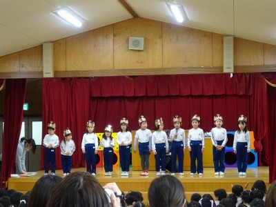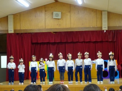 3月誕生会 2026年3月6日 3月5日(木)3月の誕生会をしました。司会の年長の合図で誕生日の子どもたちは入場しました。大きくなったらなりたいものを発表し、めだかの学校の歌を歌いました。 次にディズニー体操をしてから、一人一人プレゼントをもらいました。 最後の先生たちからのお楽しみは「変身・変身・大変身」で「何に変身したのかな?」とクイズを楽しみました。