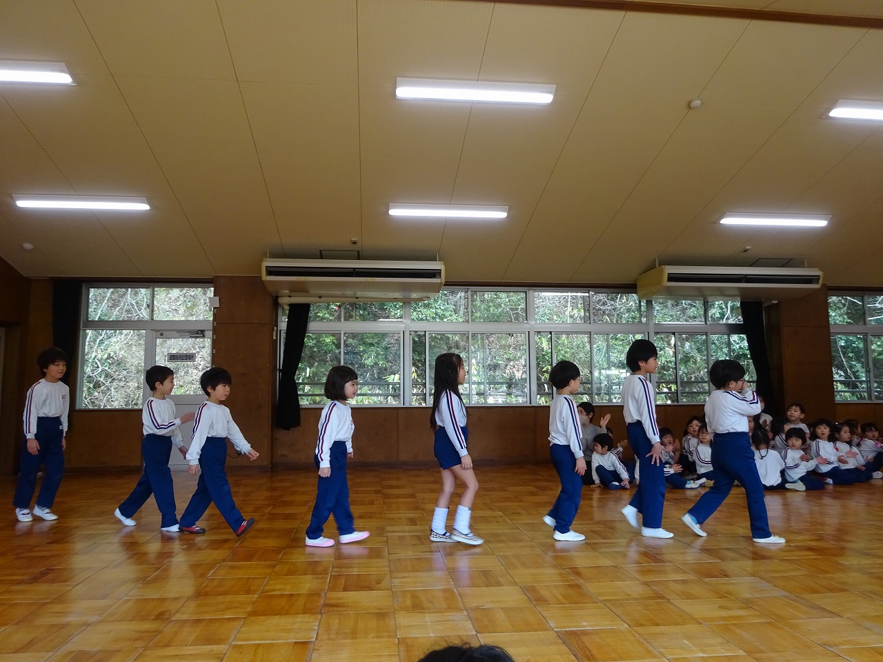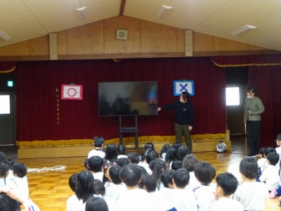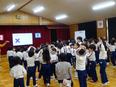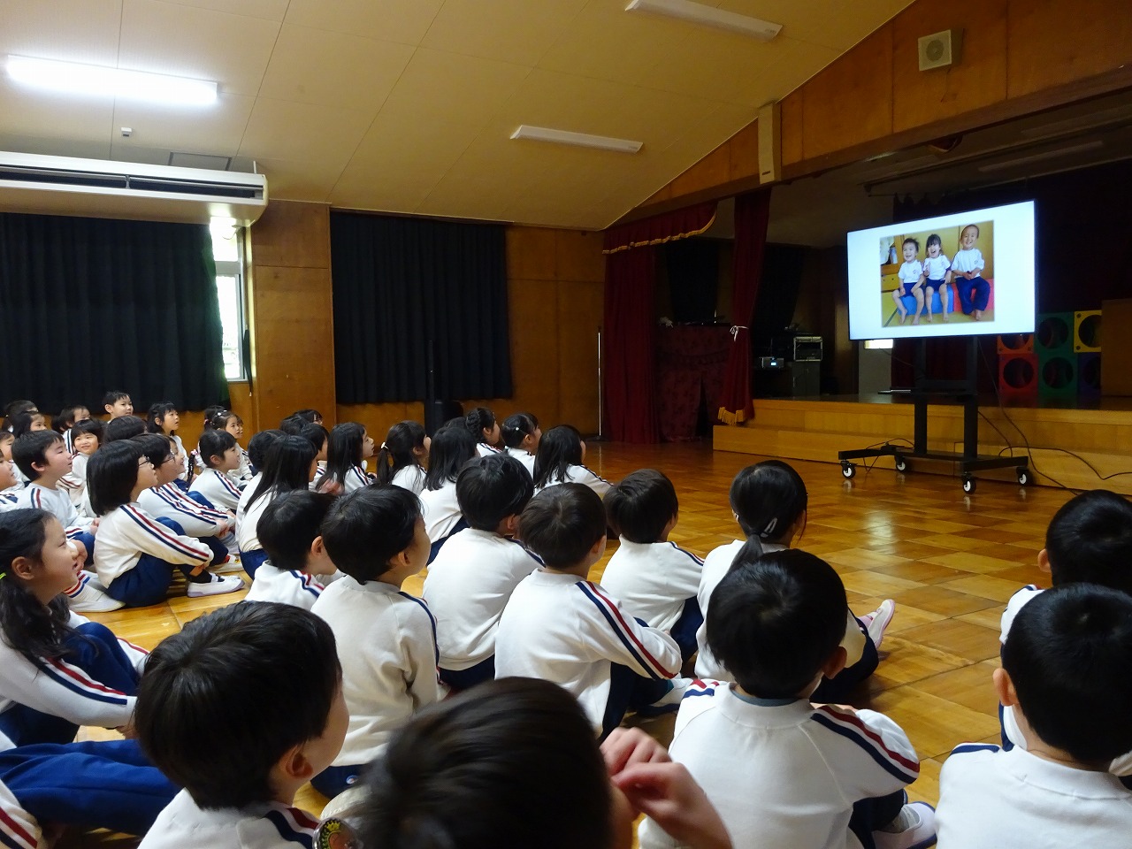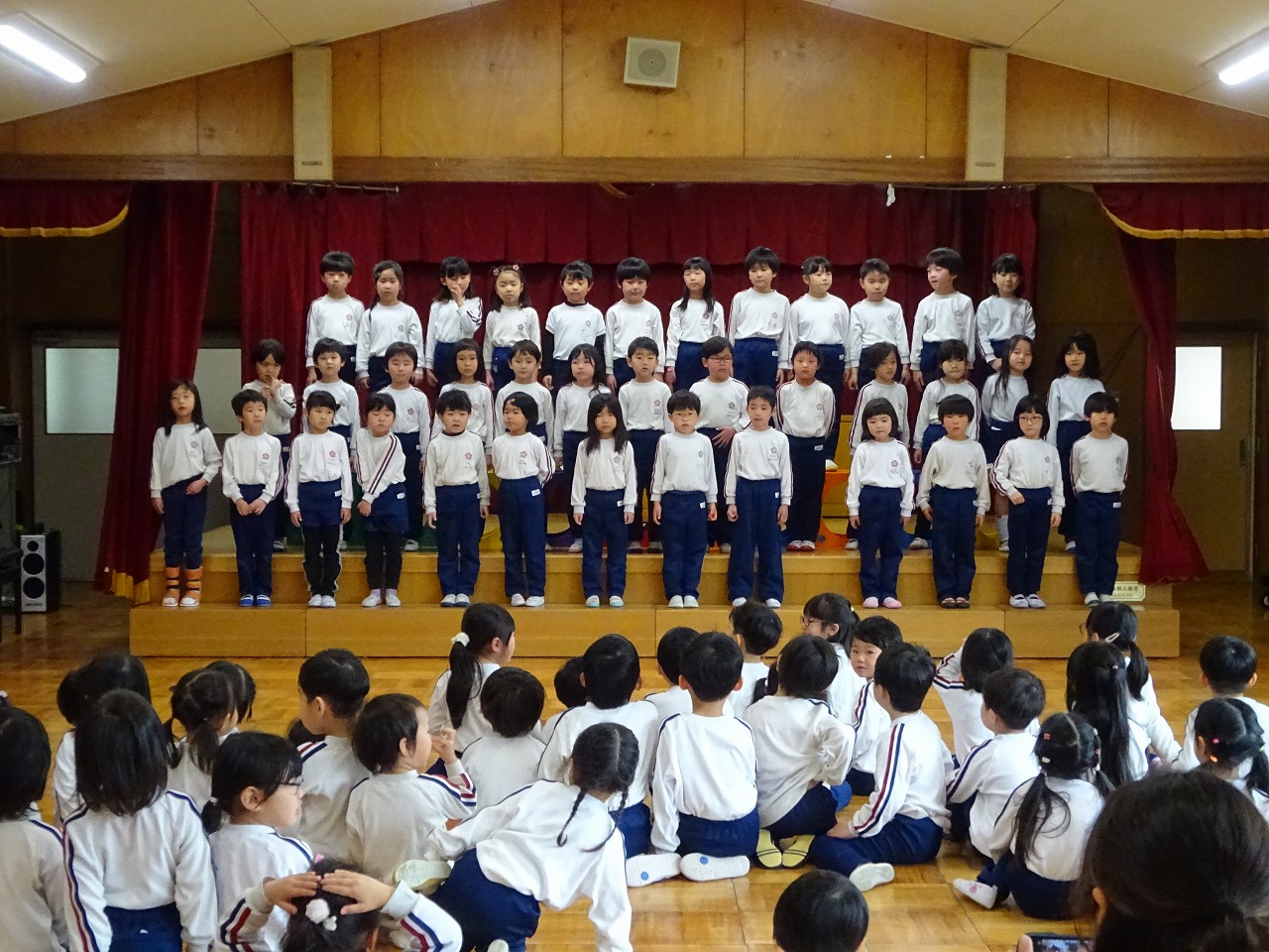 お別れ会 2026年3月12日 3月11日(水)に年少・年中・年長でお別れ会をしました。年少・年中に迎えられて入場した年長は、まず入園した時からの思い出のスライドを見ました。「懐かしい」等という大人びた声も出て、可愛らしい写真の数々に盛り上がりました。〇×クイズや体操を一緒に楽しんだ後、年長からのお礼に歌を2曲歌ってもらいました。卒園前の発表はとても上手で感動しました。部屋に帰ってからはお楽しみ給食を皆で味わって食べました。